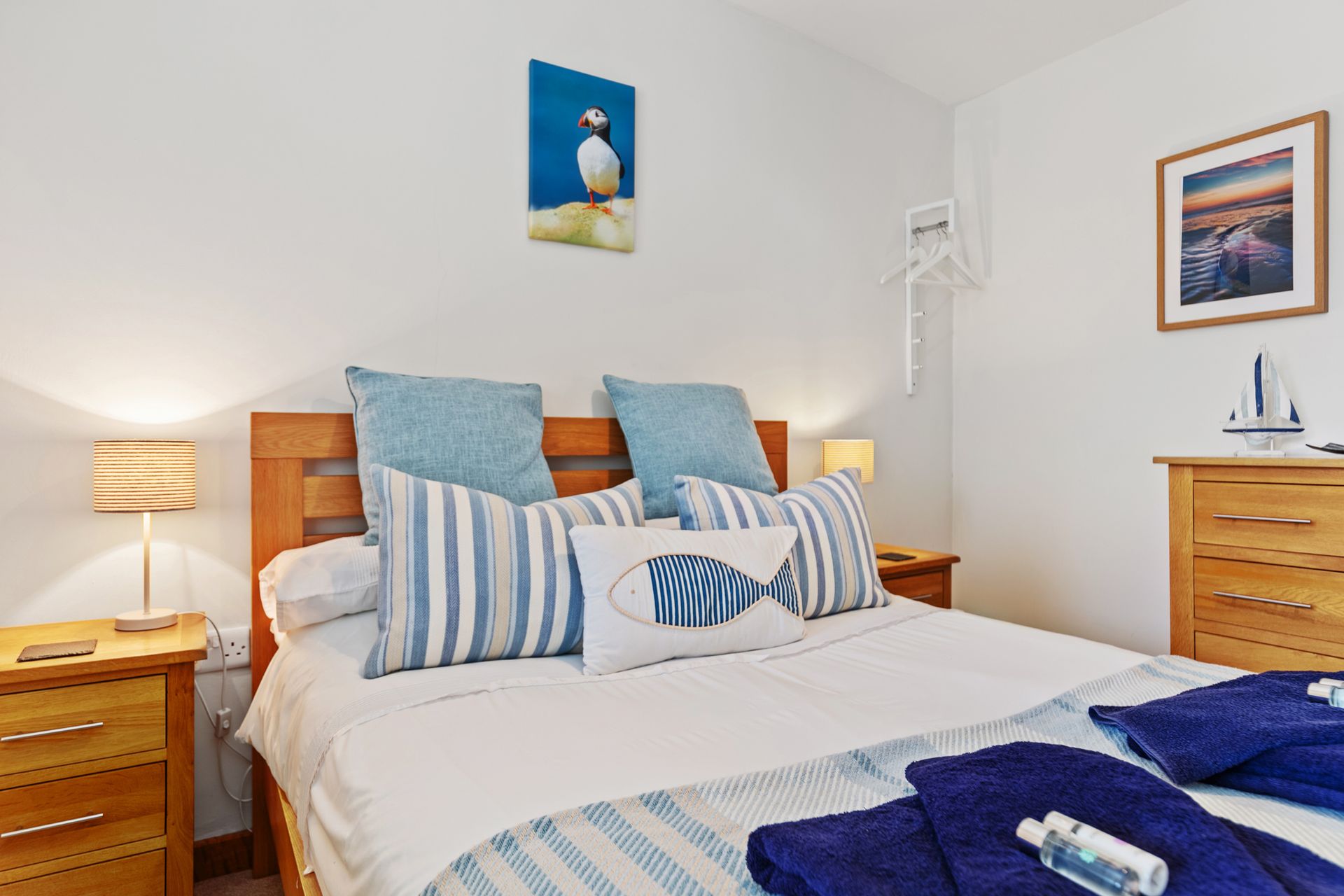 The second bedroom is a double room with an oak chest of drawers and bedside tables and lamps, decorated in seaside blue and white. The third bedroom is a twin room with white bedsteads and matching bedside tables and lamps. There is a fitted cupboard with additional storage and hanging space. All the bedrooms have quality mattresses and high thread-count luxury cotton bed linen - giving you a great night's sleep in every room.